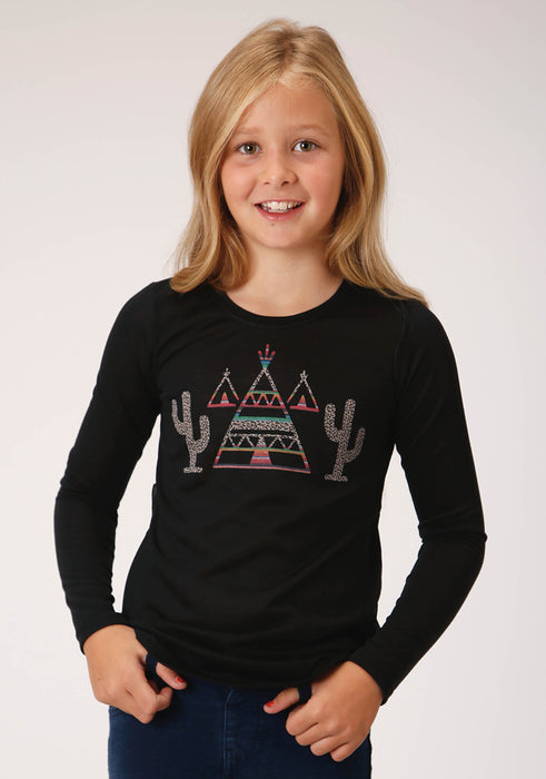 Girl's Black Jersey Knit Long Sleeve Scoop Neck Tee * Raw Edge Side Panel Accents * Screen Printed Decoration * Garment Washed For Softness