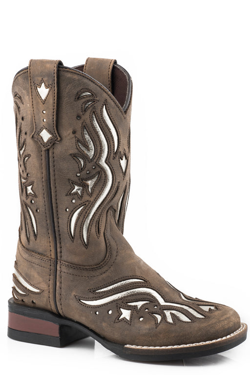 Girls Roper Burnished Brown Square Toe Boot w/ Embroidered Stars