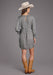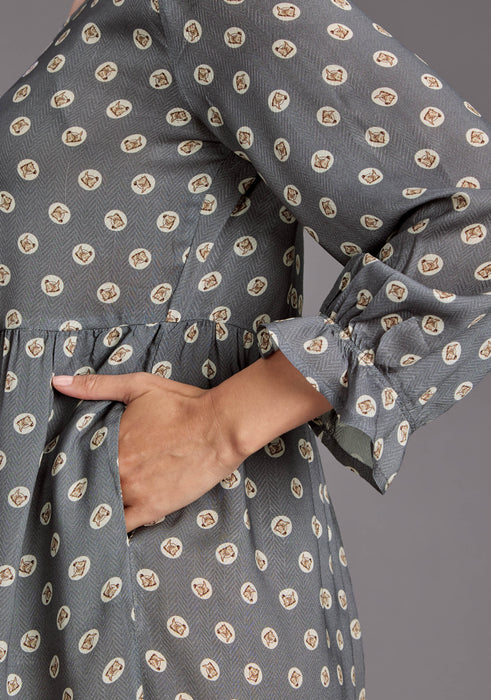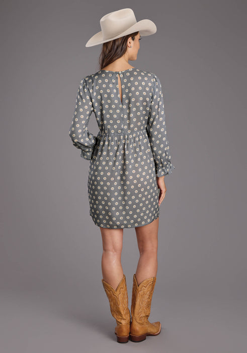Women's "Horse Pennies" Print Rayon Herringbone Dress * Scoop Neck * Drop Waist * Sleeves Gathered At Shoulders * Elastic Cuffs With Ruffles * Skirt Gathered Below Waist * Keyhole Button Closure At Center Back