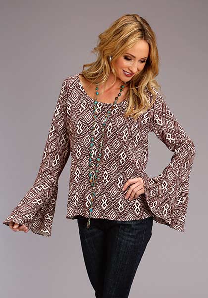 StetsonRayon Twill Wine Aztec Print Blouse * Long Raglan Open Ruffle Bell Sleeves * Boat Neckline *Stetson, STETSON, STETSON PRINTS