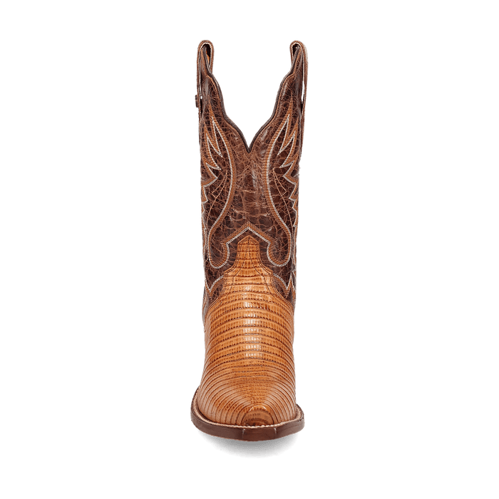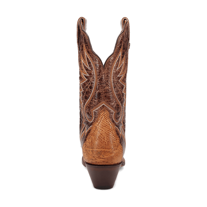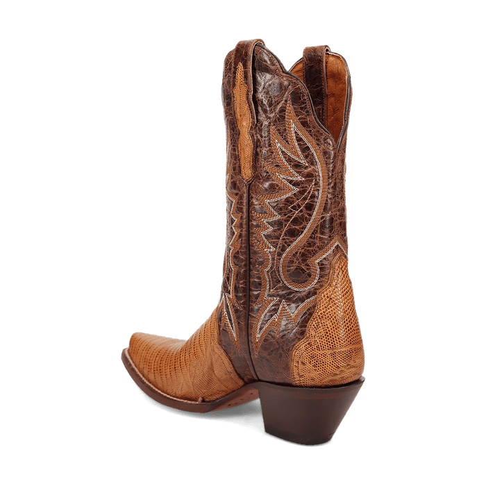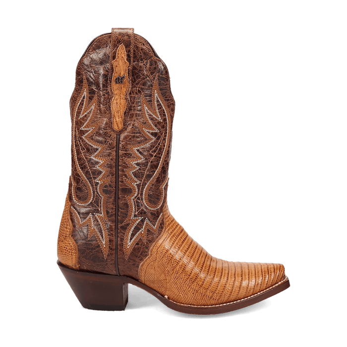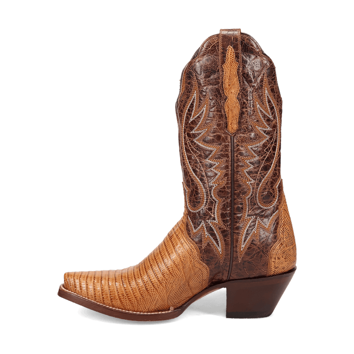 The Celine exotic boot by Dan Post seamlessly blends sophistication with timeless charm. Handcrafted from genuine Teju lizard, this exquisite boot showcases a removable soft-strike orthotic insole, a stylish snip toe, and a comfortable medium cowboy heel. Elevate your style with the Celine – the perfect blend of elegance and vintage flair.