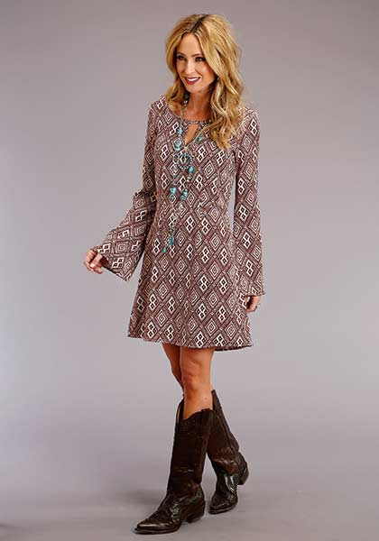 StetsonAztec Geo Print Dress With Keyhole Neckline * Fitted Bodice * Long Bell Sleeves * Invisible Zipper ClosureStetson, STETSON, STETSON PRINTS