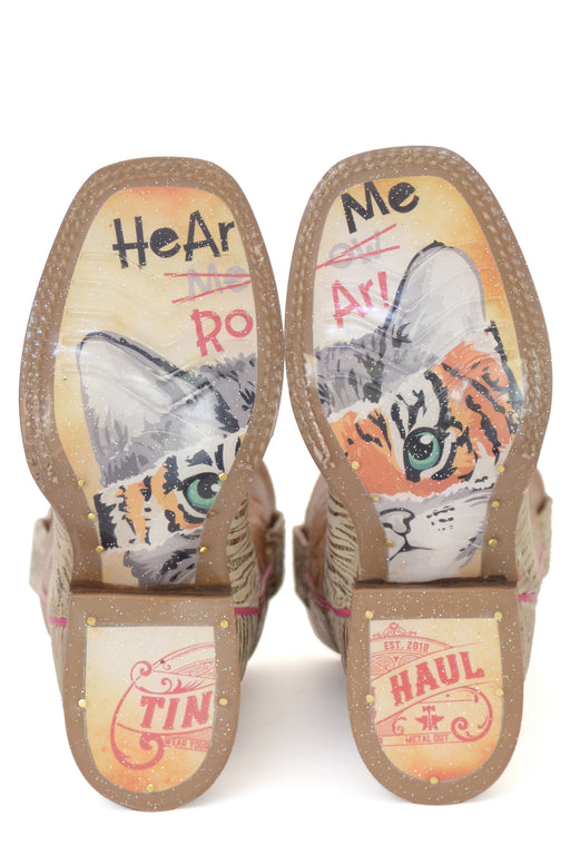 Girls Roper Tan Faux Leather Square Toe Boot w/ Pink Glitter Underlay