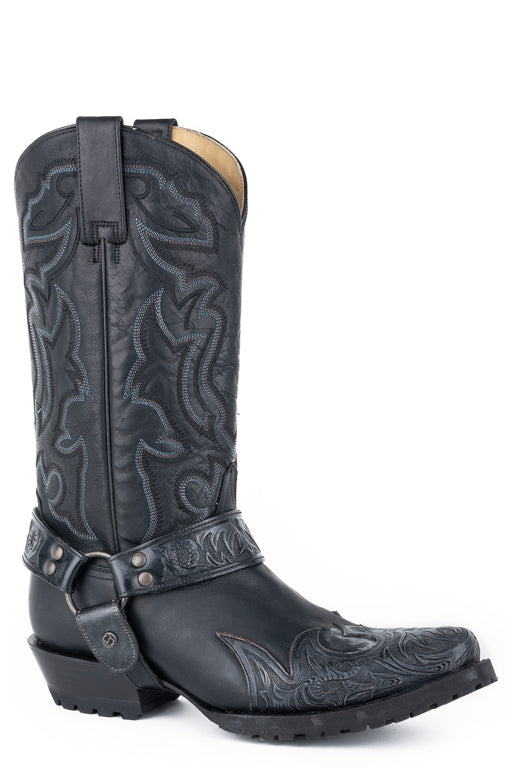 StetsonProduct Details Biker Toe Design for a Rugged, Streamlined Look Burnished Black Leather Vamp and Shaft for Sophisticated Style Non-Removable Harne...