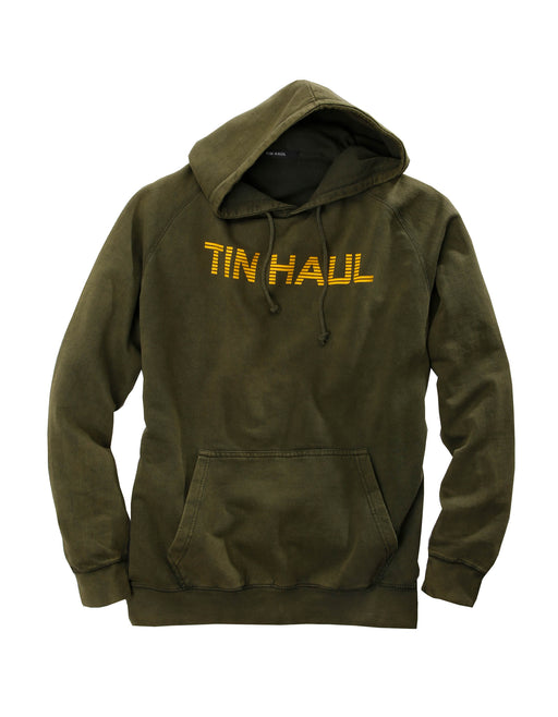 Tin HaulOlive Pigment Dyed Fleece Knit Hooded Sweatshirt * Raglan Sleeves * Front Kangaroo Pocket * Rib Knit Waistband And Cuffs * Gold "Tin Haul" Screen P...