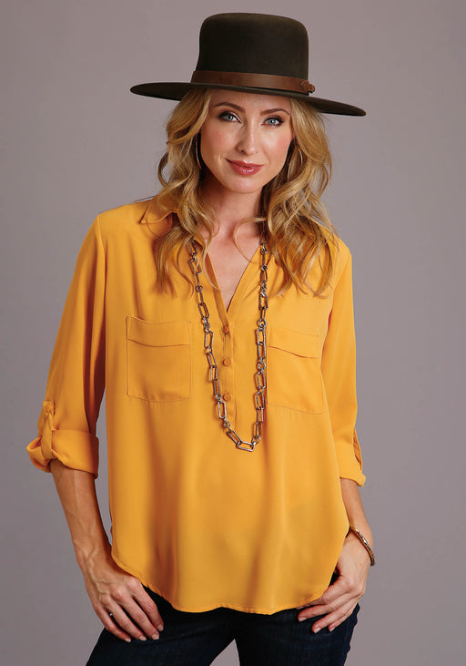 StetsonWomen's Gold Crepe ÔøΩ Sleeve Shirt Blouse * Open V-Collar With 3 Button Placket * 2 Patch Pockets At Chest * Straight Back Yoke With Button Tab An...