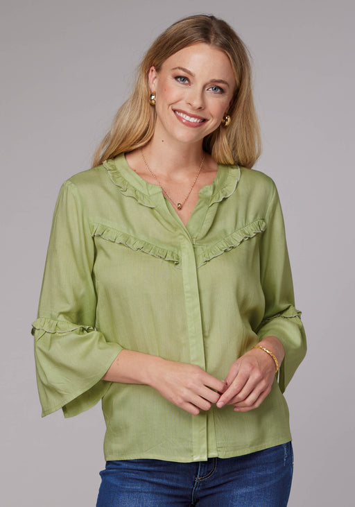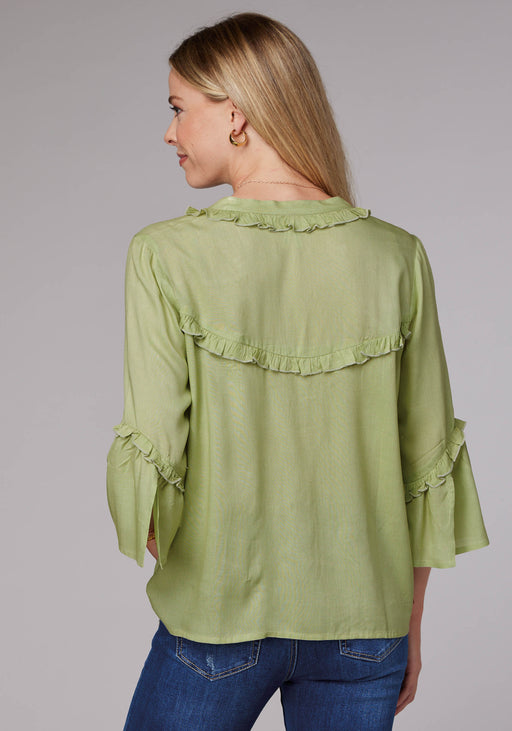 RoperWomen's Very Feminine Blouse In Solid Lime Green Rayon Challis * Ruffle Trim On Neck, Yokes And Cuffs * Elbow Length Bell Sleeves * Open V-Neck Wit...
