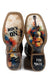 Square Toe Oily Brown Leather Vamp W/ Lazer Music Design * Embroidered Waxy Blue Leather Shaft * Handcrafted Boot * Square Toe * Double Welt * 11" Shaft * Walking Heel * Obvious Comfort Removable * Leather Lining *