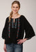 Women's Black Cotton Peasant Blouse * Raglan 3/4 Bell Sleeves * Embroidery Decoration On Front * Garment Washed For Softness
