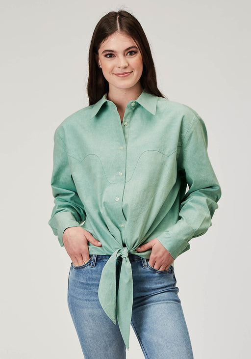 RoperWomen's Lt Blue Denim Cropped Retro Fit Western Blouse * Long Sleeve * Fancy Curve Front And Back Yokes * Tied Front * Button Closure