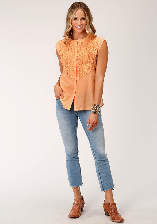 RoperWomen's Sleeveless Blouse In Apricot Light Weight Cotton Voile * Tuxedo Ruffles To Either Side Of Button Front Placket On Front