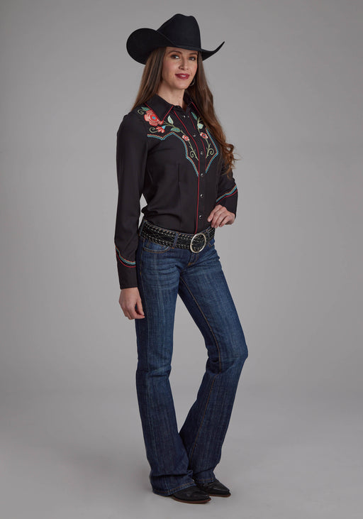 RoperWomen's Long Sleeve Western Style Shirt * Poly/Span Twill * Floral Embroidery On Front Body & Back Body * Contrast Piping * 5 Snap Caballero Cu...