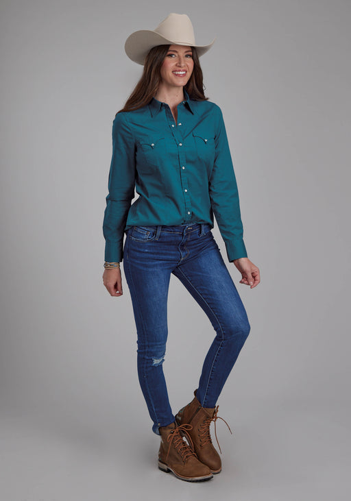 RoperWomen's Long Sleeve Western Style Shirt * Curved 1 Pt Back Yoke * Solid Cotton/Poly Broadcloth * Trimmed W/Self Piping * Smile Pockets W/Arrowpoint...