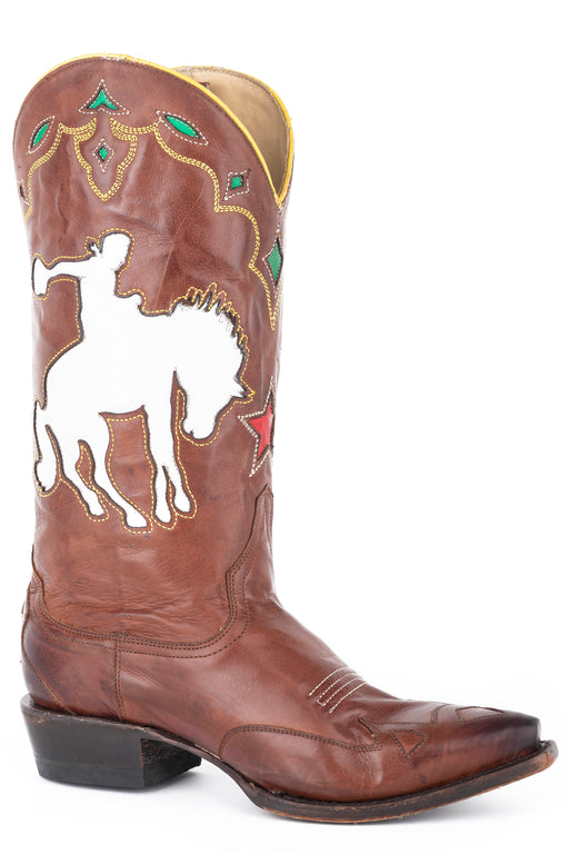Women's Stetson Brown Western Snip Toe Boot w/ Bucking Horse Underlay