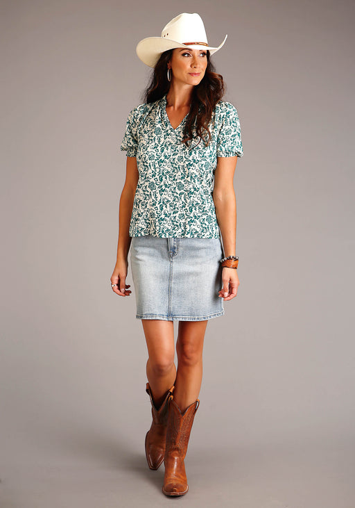 StetsonWomen's "Jade Floral" Print Rayon Short Sleeve Peasant Blouse * Sleeves Gathered At Shoulders * Shirred Sleeve Cuffs * V-Neckline With Ruffle Stand...