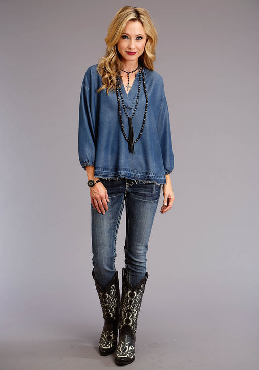 StetsonWomen's Denim Snp Frt Loose Fitting Blouse * 2 Front Patch Pockets W/Sawtooth Snp Closure Flaps * Deep V Single Pt Frt Yokes & Curved Single Pt...