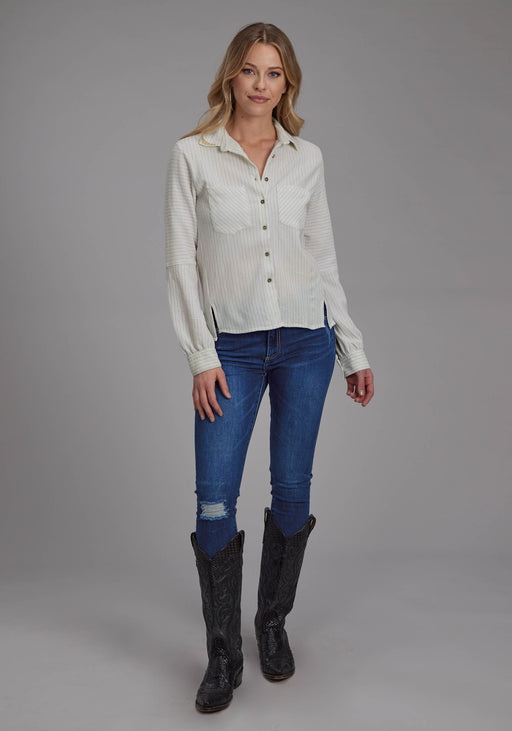 RoperWomen's Collared Button Front Blouse In Striped Cream Stretch Rayon Moss Crepe * Bishop Sleeves With Single Button Cuffs * Single Point Patch Pocke...