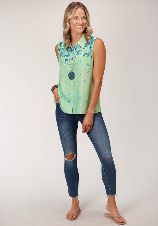 RoperWomen's Western Boot Printed Rayon Sleeveless Blouse * Denim Front & Back Yokes * 1 Pt Flap Pockets * Snap Front * Garment Washed For Softness