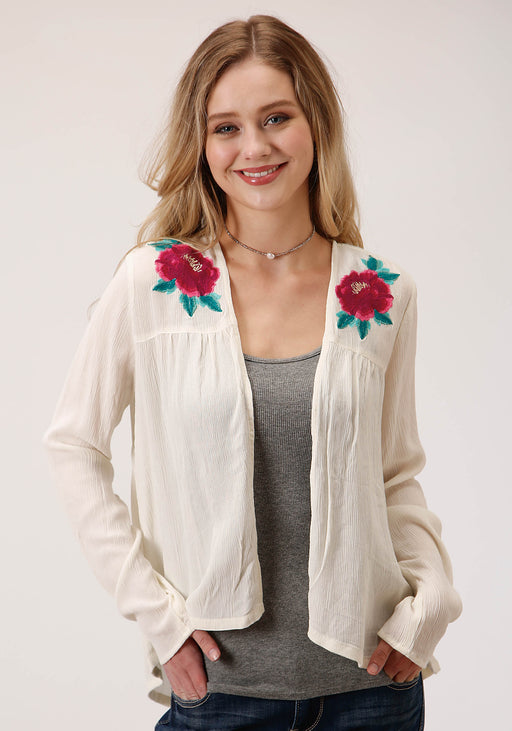 RoperWomen's Cream Rayon Crepe Short Length Cardigan * Long Sleeve * Embroidery Embellishment On Front & Back Yokes * Shirt Tail Hem * Garment Washe...