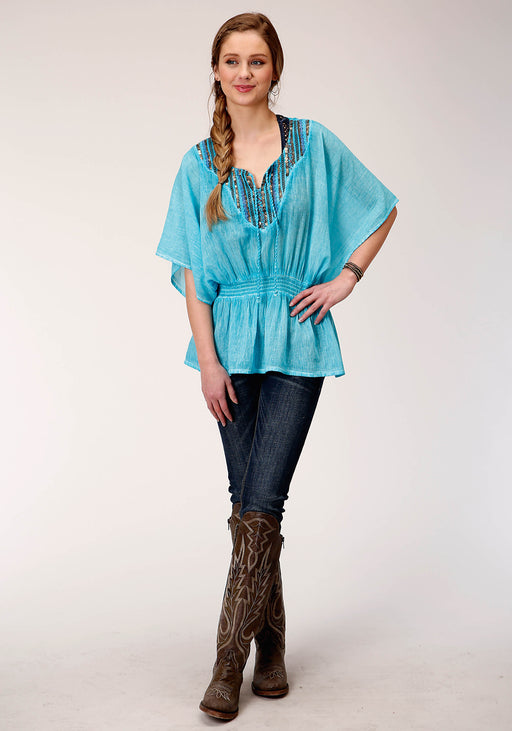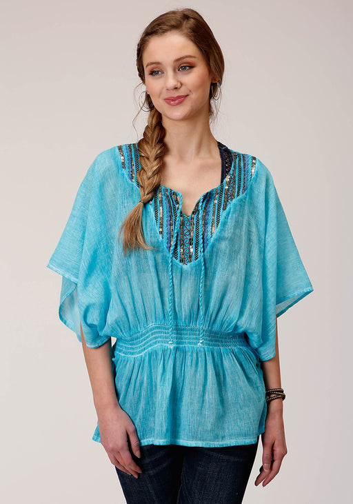 RoperWomen's Turquoise Cotton Crepe Oversized Peasant Top * Scoop Neckline With Tie * Elastic Smocking Waistline * Dolman Sleeve * Multiple Embellishmen...