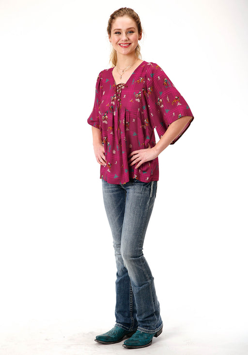 RoperWomen's Retro Cowboys Printed Rayon Blouse * Dolman Short Sleeve * Empire Waist * Open V Neck With Faux Leather Tie * Garment Washed For SoftnessRo...