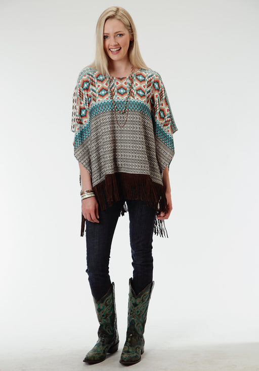 RoperRight On Trend * Great Looking Sweater Jersey Poncho In A Beautiful Aztec Border Print * Faux Suede Fringe Finishes The Hem * Looks Great With Cowb...
