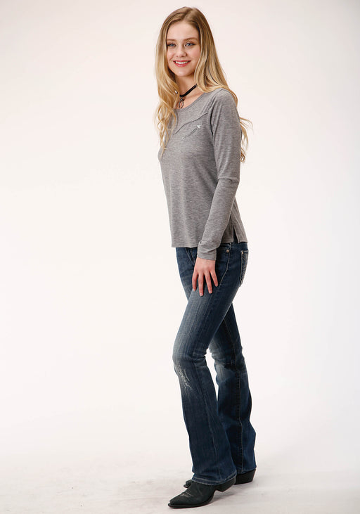 RoperWomen's Grey Jersey Knit Scoop Neck Top * Long Sleeve * Fancy Front Yoke With Raw Edge Detail * Faux Smile Pockets With Embroidered Stars * Hi-Low ...