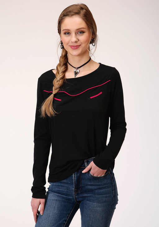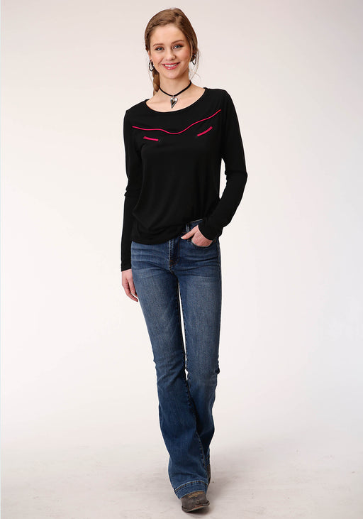 RoperWomen's Black Jersey Knit Long Sleeve Scoop Neck Tee * Fancy Front Yoke * Faux Smile Pockets With Embroidered Stars * Garment Washed For SoftnessRo...