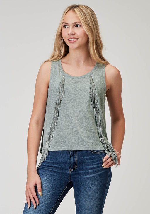 RoperWomen's Heather Grey Jersey Knit Swing Tank Top * Scoop Neck * Hi/Low Hem * Fringe Embellishment