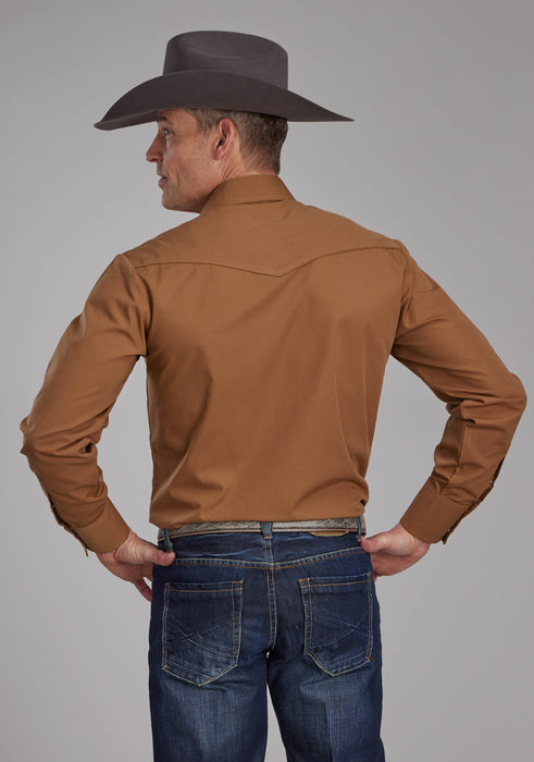 Men's Long Sleeve Western Style Shirt * Curved 1 Pt Back Yoke * Solid Cotton/Poly Broadcloth * Trimmed W/Self Piping * Smile Pockets/No Arrowpoints * Embroidery On Front Yokes * 3 Snap Cuff
