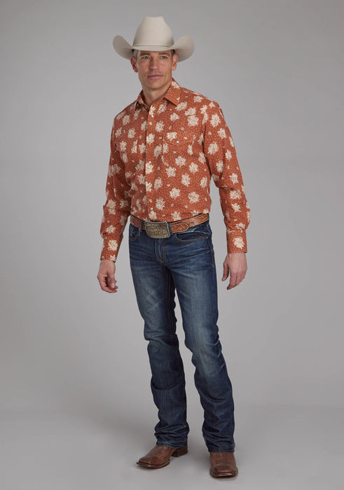 Men's Long Sleeve Western Style Shirt * Standard 1 Pt. Front & Back Yokes * Patch Pockets & Flaps * Cotton/Poly Printed Fabric With Allover Or Wallpaper Stripe Florals * 3 Snap Shaped Barrel Cuffs