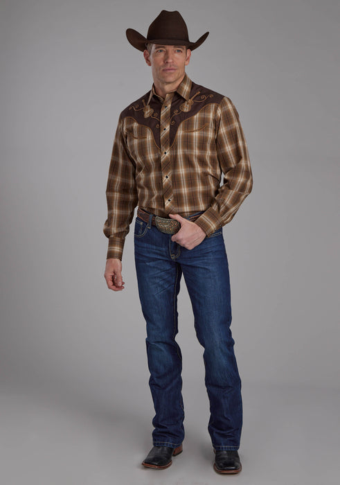 Men's Long Sleeve Shirt * Fancy Frt Yoke W/Applique * 1 Pt Curved Bk Yoke * Plaid Cotton/Poly Broadcloth * Pieced & Piped W/Solid Cotton/Poly Broadcloth * Smile Pockets/No Arrow Pts * 3 Snap Cuff