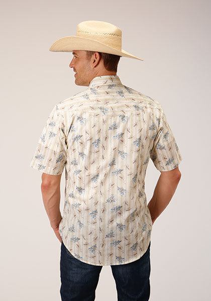 Men's Short Sleeve Western Style Shirt * Standard 1 Pt. Front & Back Yokes * Patch Pockets & Flaps * Cotton/Poly Fabric Printed With Allover Or Wallpaper Stripe Florals