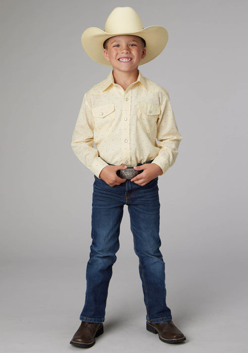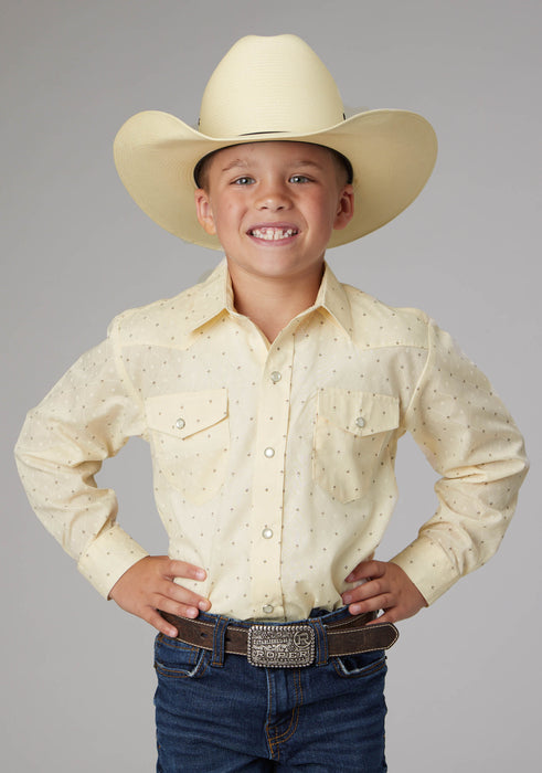 Boy's Long Sleeve Western Style Shirt * Standard 1 Pt Front & Back Yokes * Patch Pockets & Flaps * Cotton/Poly Printed Fabric With Allover Or Wallpaper Stripe Florals * 1 Snap Cuff