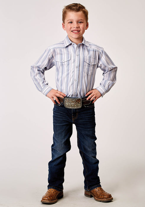 Boy's Long Sleeve Western Style Shirt * Standard 1 Pt. Front & Back Yokes * Patch Pockets & Flaps * Striped Cotton/Poly Broadcloth * 1 Snap Cuff