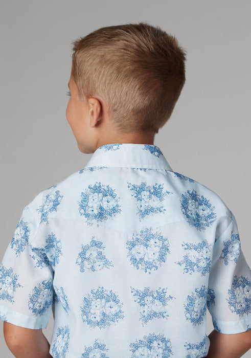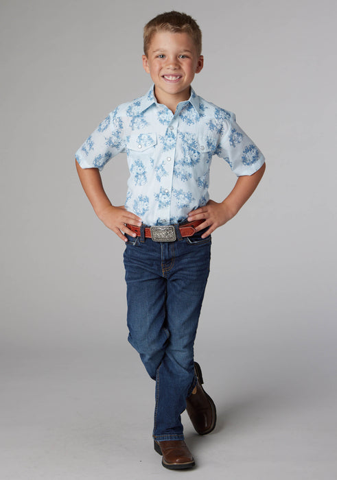 Boy's Short Sleeve Western Style Shirt * Standard 1 Pt Front & Back Yokes * Patch Pockets & Flaps * Cotton/Poly Printed Fabric With Allover Or Wallpaper Stripe Florals