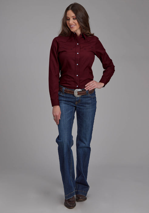 Women's Long Sleeve Western Style Shirt * Curved 1 Pt Back Yoke * Solid Cotton/Poly Broadcloth * Trimmed W/Self Piping * Smile Pockets W/Arrowpoints * F/B Darts * Embroidery On Back Yoke * 1 Snap Cuff