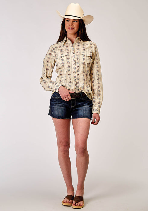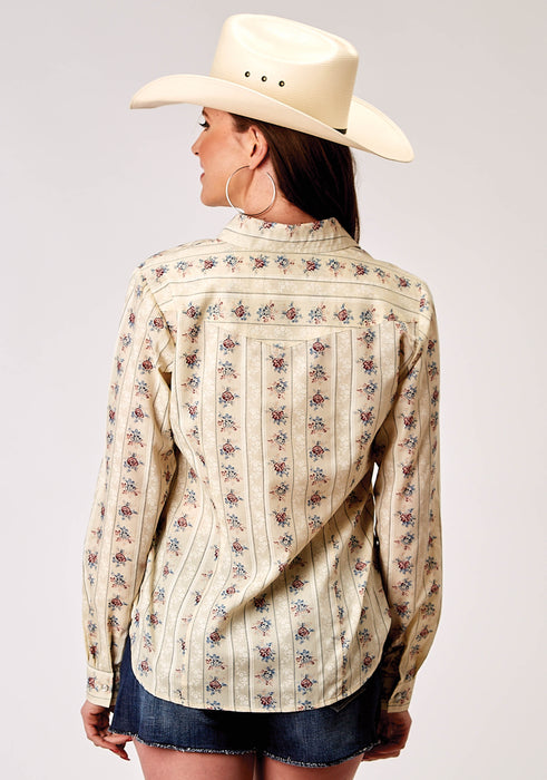 Women's Long Sleeve Western Style Shirt * Standard 1 Pt Front & Back Yokes * Patch Pockets & Flaps * Cotton/Poly Printed Fabric With Allover Or Wallpaper Stripe Florals * Front/Back Waist Darts * 1 Snap Cuff