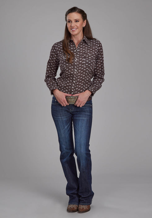 Women's Long Sleeve Western Style Shirt * Standard 1 Pt Front & Back Yokes * Patch Pockets & Flaps * Cotton/Poly Printed Fabric With Allover Or Wallpaper Stripe Florals * Front/Back Waist Darts * 1 Snap Cuff