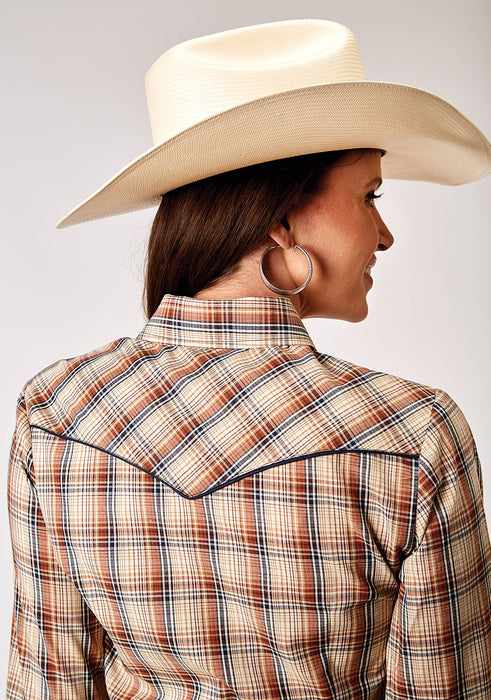 Women's Long Slv Western Style Shirt * Curved 1 Pt Back Yoke * Plaid Cotton/Poly Broadcloth Trimmed W/Solid C/P Piping * Smile Pockets - No Arrow Point * F/B Darts * 1 Snap Cuff