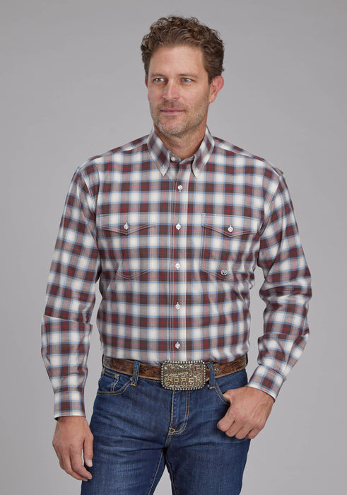 Men's Long Sleeve Shirt * 97% Cotton/3% Stretch * Bttn Dn Collar * 1 Pt Back Yoke W/Pleat & Locker Loop * 2 One Point Pkts & Flaps * Roper "R" Embroidery
