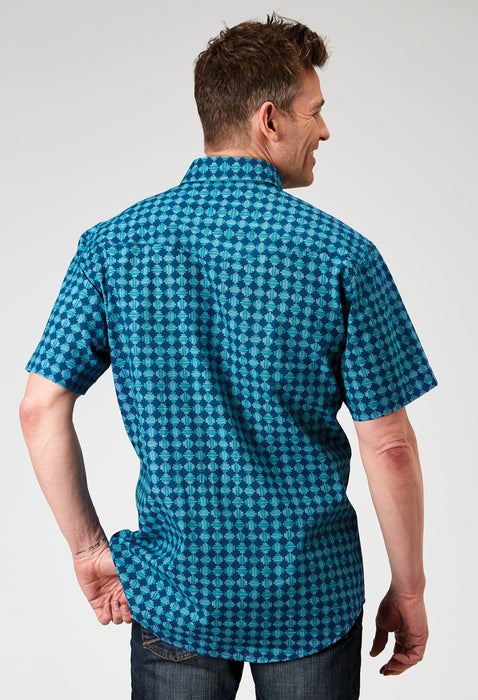 Men's Short Sleeve Shirt * Allover Print On 100% Cotton Poplin * 1 Pt Curved F/B Yokes * Shaped 1 Pt Pockets & Flaps * Pearl Snap Front * Garment Washed