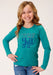 Girl's Turquoise Jersey Knit Tee * Long Sleeve * Scoop Neckline * 1 Pt Front Yokes * Screen Print Decoration * Garment Washed For Softness