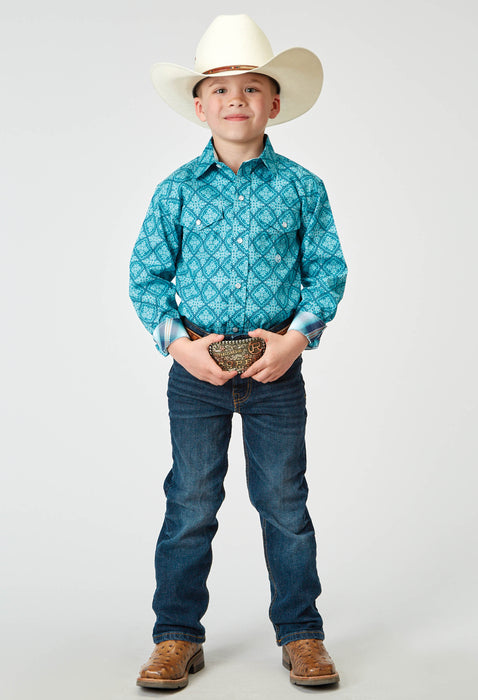 Boys Long Sleeve Western Shirt * Snap Front * Spread Collar * 1 Point Back Yoke * 2 One Point Pockets & Flaps * Roper "R" Embroidery