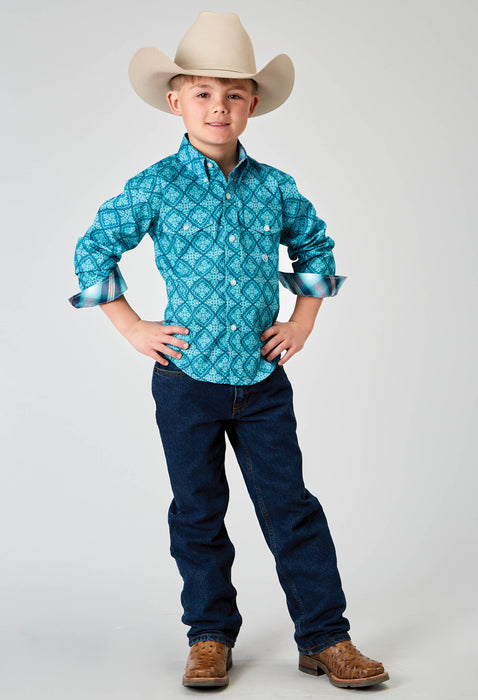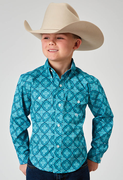 Boy's Long Sleeve Western Shirt * Button Front * Button Down Collar * 1 Point Back Yoke W/Pleat & Locker Loop * 2 One Point Pockets & Flaps * Roper "R" Embroidery