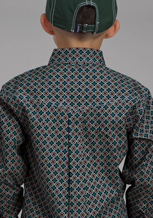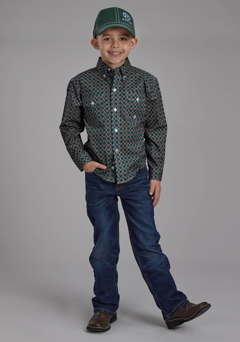 Boy's Long Sleeve Western Shirt * Button Front * Button Down Collar * 1 Point Back Yoke W/Pleat & Locker Loop * 2 One Point Pockets & Flaps * Roper "R" Embroidery