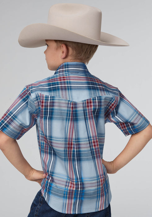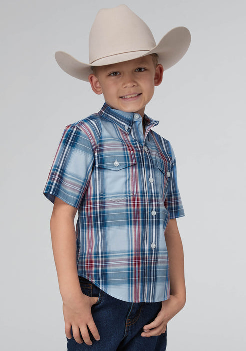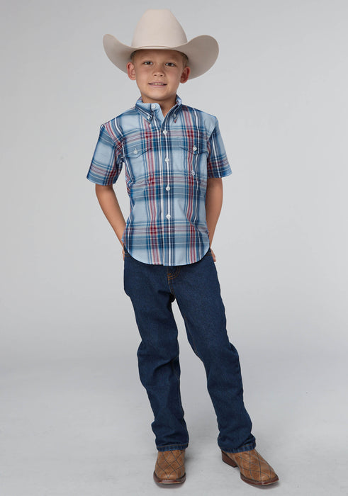 Boy's Short Sleeve Western Shirt * Button Front * Button Down Collar * 1 Point Back Yoke W/Pleat & Locker Loop * 2 One Point Pockets & Flaps * Roper "R" Embroidery