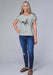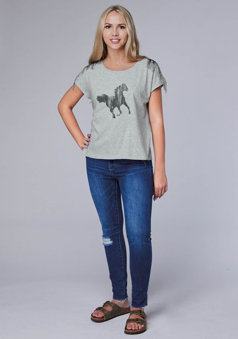 Women's Heather Grey Jersey Knit Tee * Crew Neck * Short Sleeve With Fringe Trim * Screen Printed Decoration