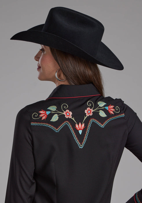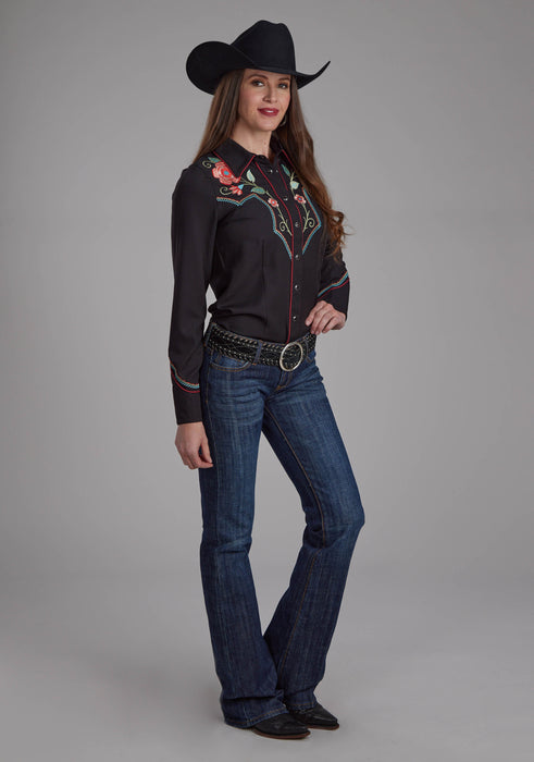 Women's Long Sleeve Western Style Shirt * Poly/Span Twill * Floral Embroidery On Front Body & Back Body * Contrast Piping * 5 Snap Caballero Cuff * Satin Trim On Inside Collar Band & Inside Bk Yoke * F/B Darts