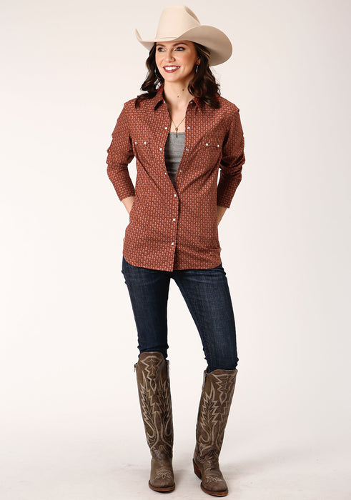 Women's Long Sleeve Shirt * Printed 100% Cotton Poplin * 1 Pt Curved Front & Back Yokes * 1 Pt Curved Pockets W/2 Pt Curved Flaps * 3 Snap Cuff * Cream Opaque Snaps * Waist & Bust Darts * Garment Washed